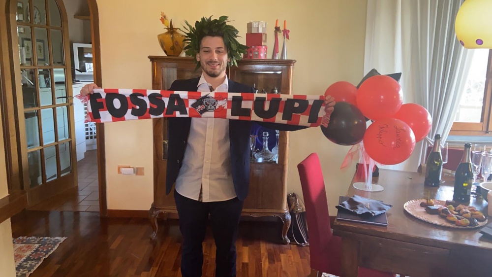 Basta guardare la foto che orgogliosamente ritrae Filippo con i simboli del suo successo e della sua fede: la corona d’alloro simbolo di sapienza, e la sciarpa dei Magici Lupi simbolo della sua appartenenza.